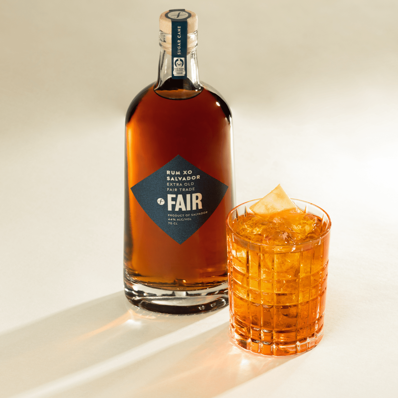 - Add a large ice cube. Pour in 60 ml of FAIR Rum and stir.